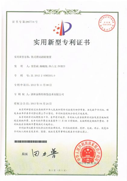 重视知识产权,不断进行创新,凭着以技术行业的理念,TST公司又获得了由知识产权局颁发的四项发明利证书,分别是两项实用新型:臂式摆动跟随装置、种便携式钢丝绳损伤探测装置。两项外观利:钢丝绳探伤仪(防爆可携带型)、钢丝绳探伤仪(携带式大直径型)。