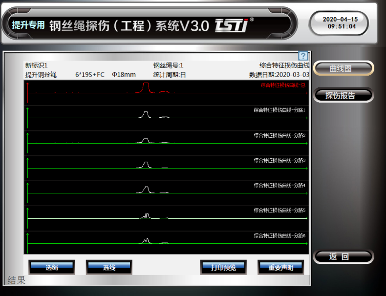 在系统软件中可查看实时探伤曲线,探伤数据报表实时了解钢丝绳损伤状况,记录钢丝绳随时间变化的损伤状态(趋势)。系统增加智能化AI统计算法,有效的剔除异常杂点,使探伤数据准确可靠,重复性好。同时增加无标定算法,可有效解决设备温度引起的漂移和检测方向干扰问题。
