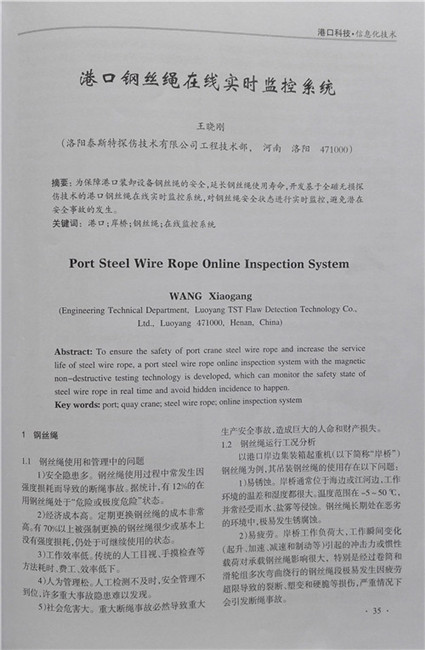随着公司新市场开拓不断深入,市场反响逐渐升温,尤其是面对港口行业对钢丝绳安全问题关注度和解决方案渴求的急剧提升,针对港口行业的特殊工况环境和安规范要求,我公司和某港口达成战略合作伙伴友好关系,为该港现场各类提升设备钢丝绳提供安全监测方案。丰富完备的港口现场数据和行业的钢丝绳磁检测技术结合成系列港口用钢丝绳在线实时智能监测系统。为了推而广之向更多港口客户提供TST产品保障安全的科技力量,同时也为了让港口客户对TST产品及技术方案在港口适用性有充分详细的了解,TST 公司在港口行业权威性期刊《港口科技》2016年3月刊出《港口钢丝绳在线实时监控系统》论文。