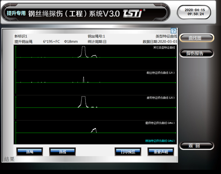 TST钢丝绳探伤(工程)系统是一种针对各种工况提升钢丝绳的损伤现象实时在线无损探伤的工程设备系统。该系统以“KJ578煤矿用钢丝绳探伤系统”为硬件平台,搭载“TST钢丝绳探伤(工程)系统V4.0”专业分析软件,采用“变量补偿传感器”、“三维磁感应桥”和“自平衡同步励磁”等无损探伤专利技术综合集成可全天候无人值守在线实时探测钢丝绳内外部断丝、锈蚀、疲劳、磨损及变形等各种损伤隐患,通过LMA曲线分析,评估钢丝绳的使用寿命。